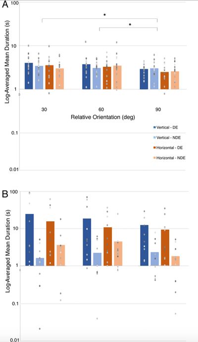This was a project with a fairly small data set, and very simple bar graphs are used. The challenge here was to summarize the results for observers with normal binocular vision (called stereonormals) as well as a diverse group of subjects with abnormal binocular vision. The solution was to plot each data point and the group means together. Each gray dot represents the score for one observer, and the blue bars plot the mean for each group. In some cases, the gray dots are shifted horizontally so that they don't occlude each other. Interesting aspects of the data are thus made visible. For example, in panel A, the test is too easy for normal subjects (large scores are good), and the discrete nature of the scores can be seen. In panel B, the test is too hard for the anomalous subjects (large scores are bad), and the scores are more continuous on the y-axis.